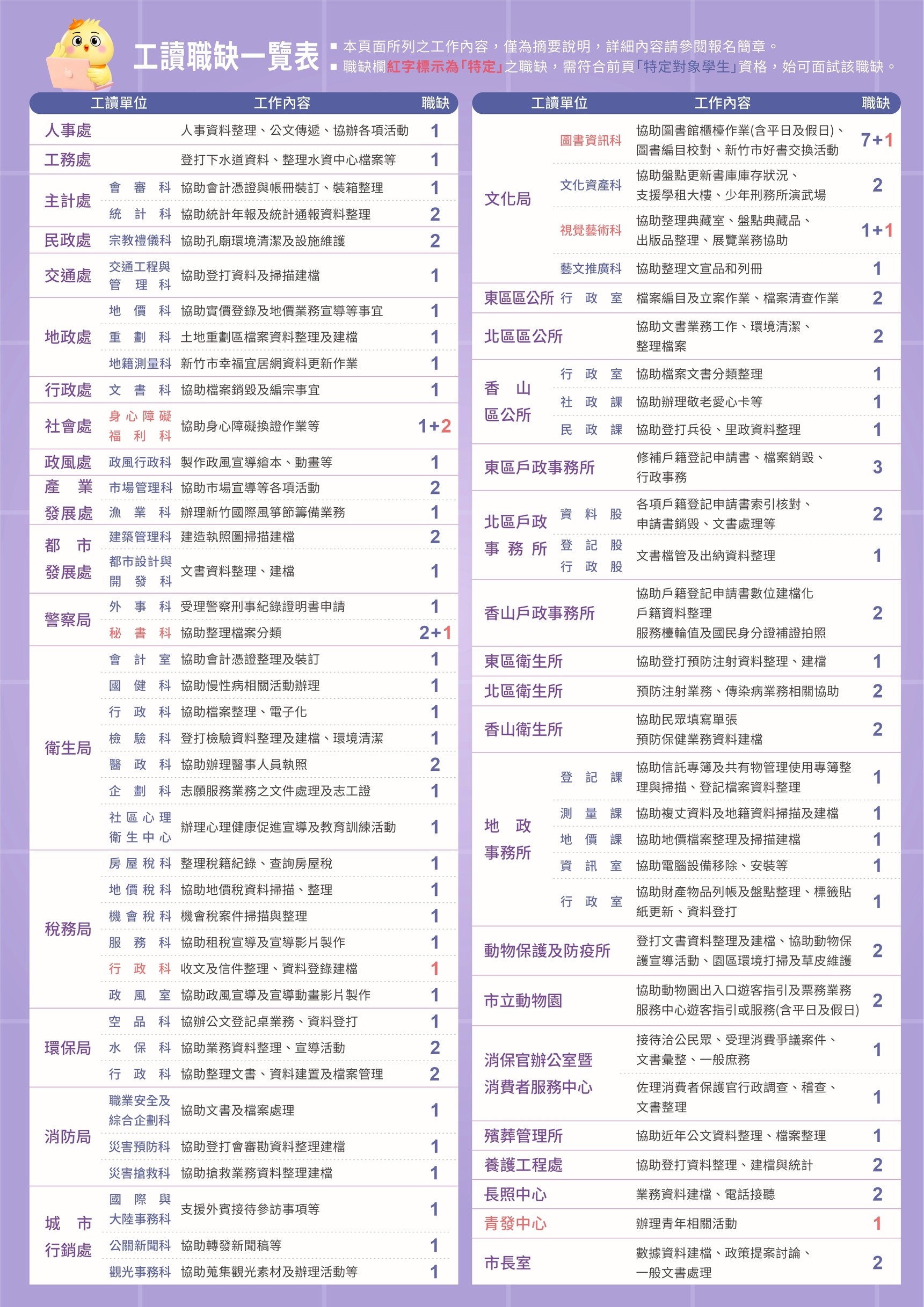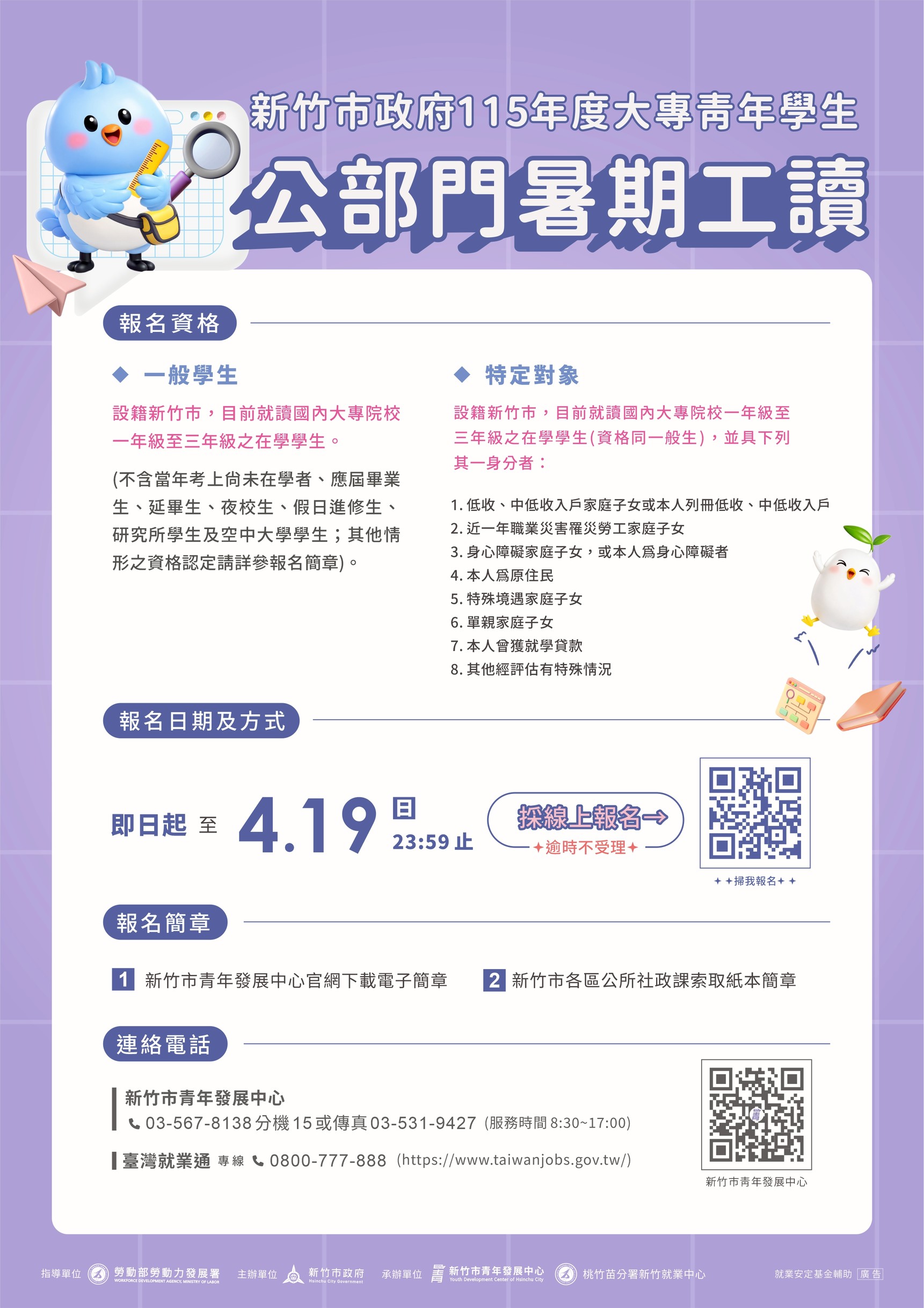 新竹市青年發展中心為提供大專院校青年學生職場體驗之機會,本市辦理115年度「大專青年學生公部門暑期工讀活動」及「特定對象青年學生公部門暑期工讀活動」,請貴校惠予協助宣導報名資訊,請查照。