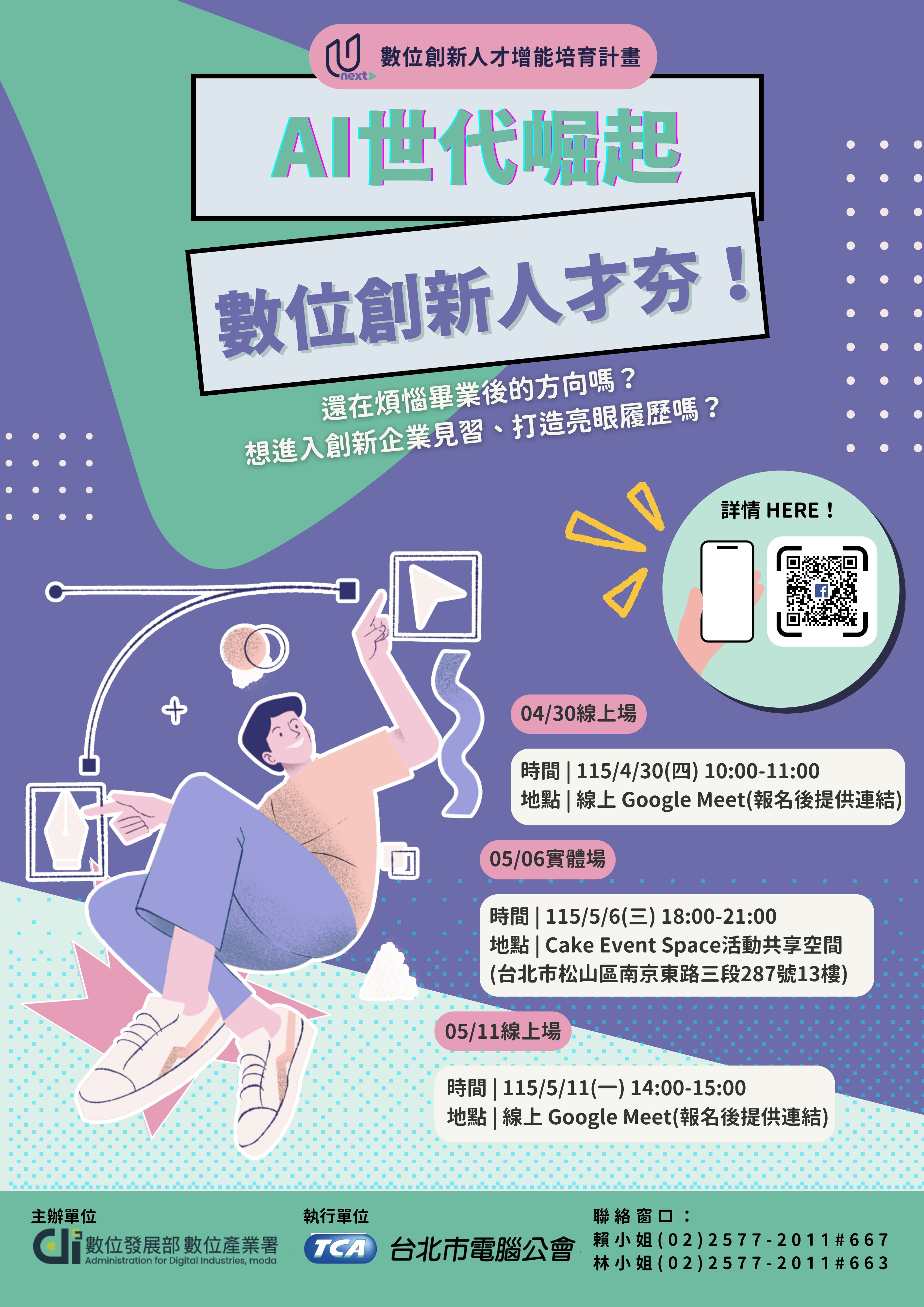 一、台北市電腦商業同業公會受數位發展部數位產業署委託執行「數位創新人才增能培育計畫(以下簡稱本計畫)」,以「主題式課程結合實戰專案見習」方式,媒合數位創新企業提出專題及職缺,徵集國內大專校院本國生及僑外生參與(不限科系,以大三(含)以上學士、碩博士在學學生為限,不含在職生),投入產業實務見習,以培育數位創新領域人才發展。