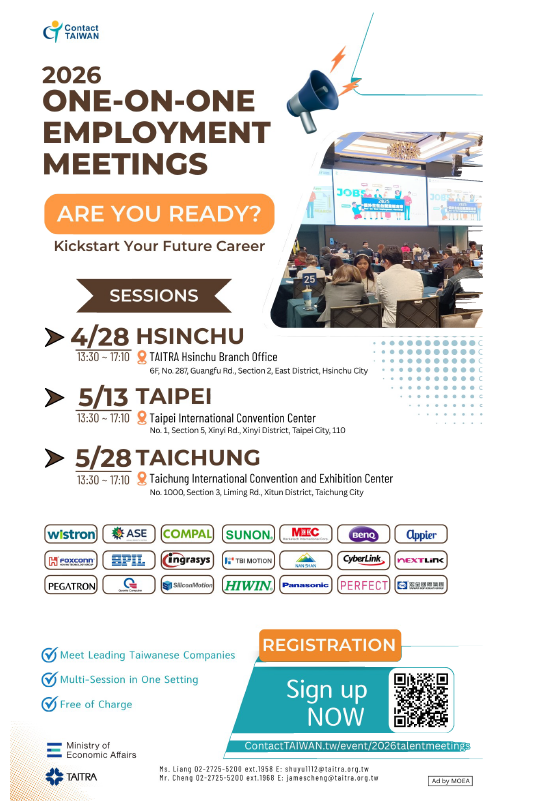 Register for free at https://ContactTAIWAN.tw/event/2026talentmeetings to join as a member, and secure your interview slot now.