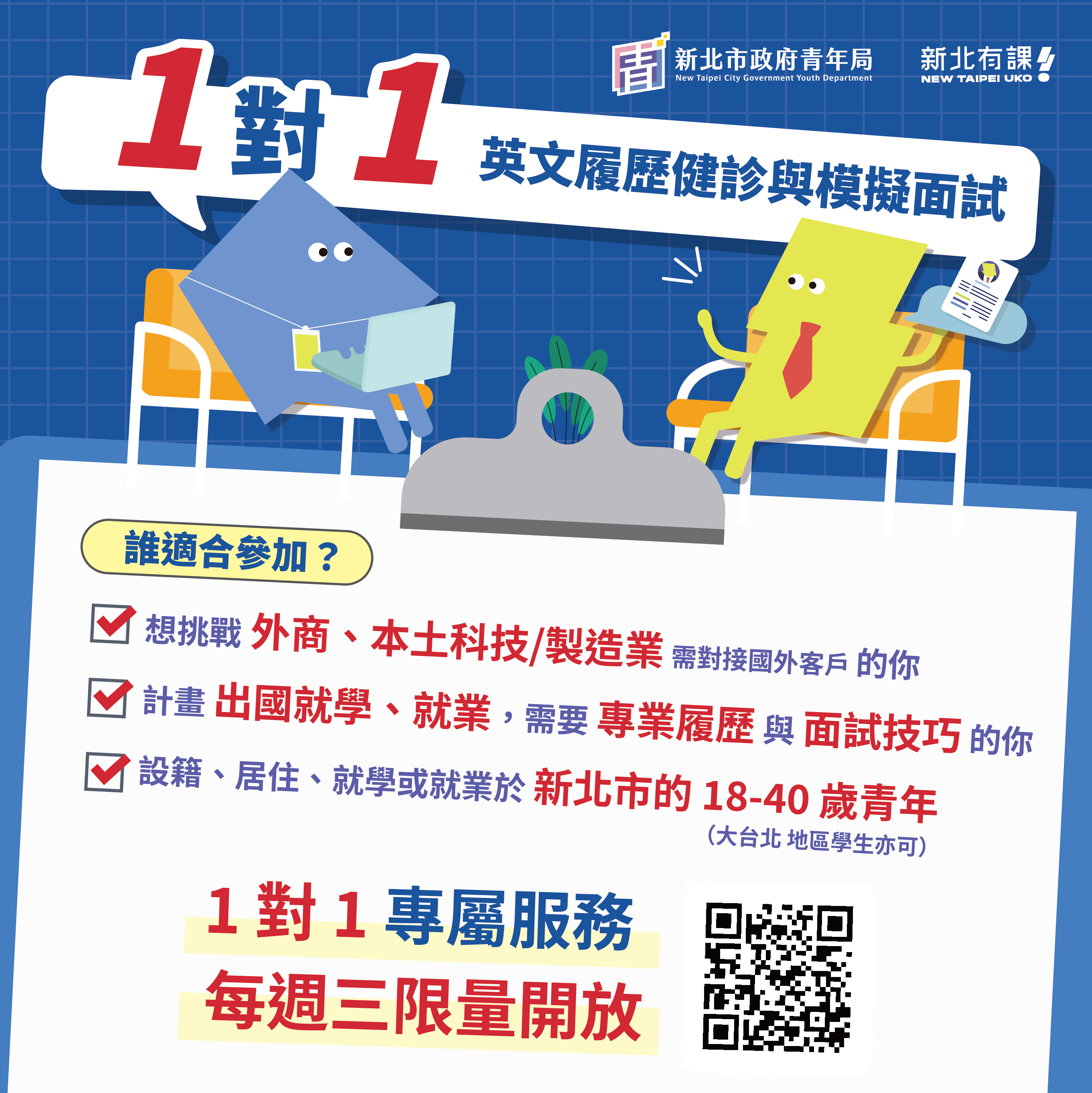 【新北市政府青年局】辦理免費「一對一英文履歷健診及模擬面試」,檢附服務電子圖卡