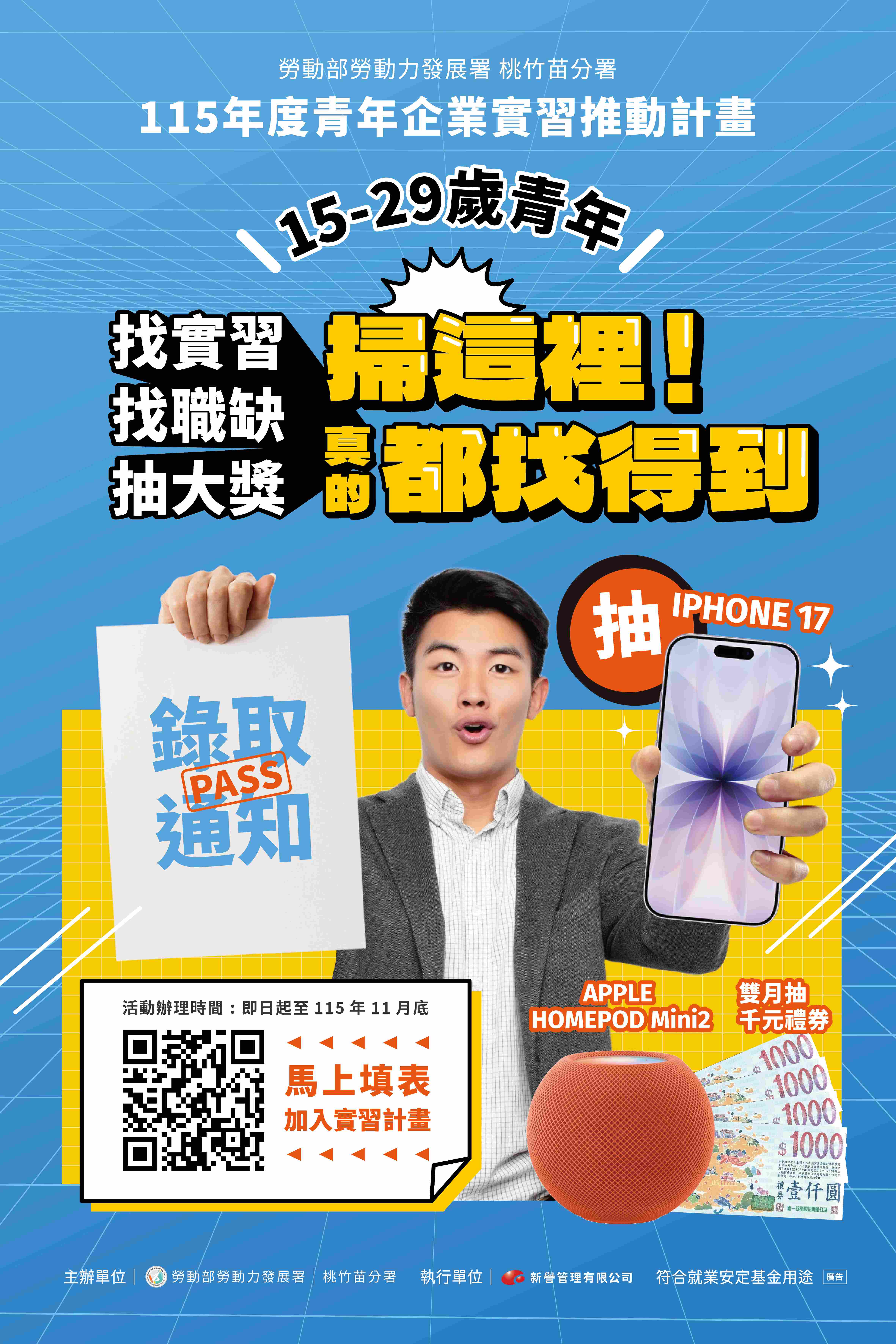 三、獎勵措施:提供階段性抽獎,獎項包含千元超商禮券、HomePod mini、iPhone17等;報名方式請參閱活動網站(https://forms.gle/gnhsBN6ShSQsPSHLA),或加入官方LINE社群「賈桃樂青年實習」掌握最新消息。