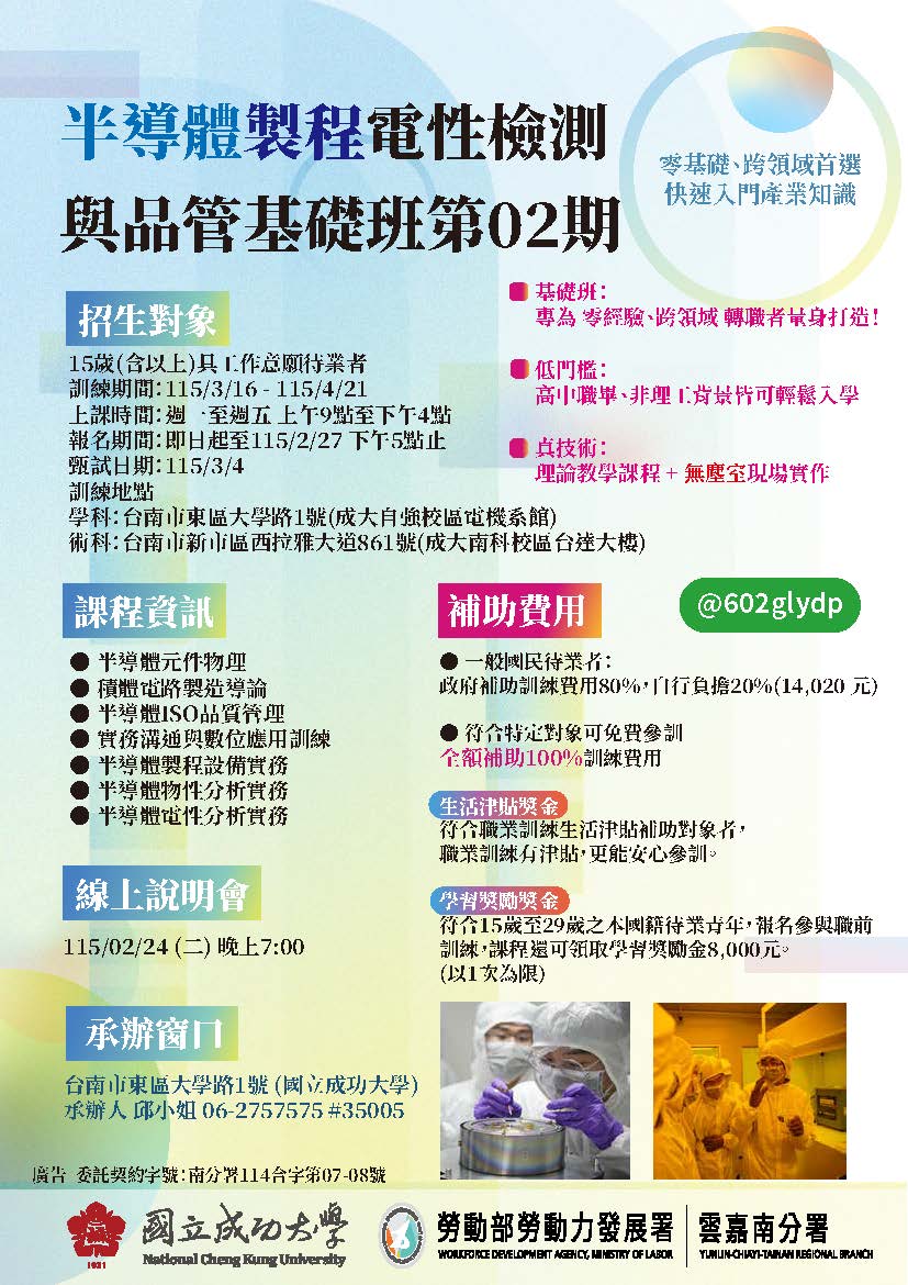 【國立成功大學】辦理勞動部職前訓練課程「半導體製程電性檢測與品管基礎班第02期」,請踴躍報名參加