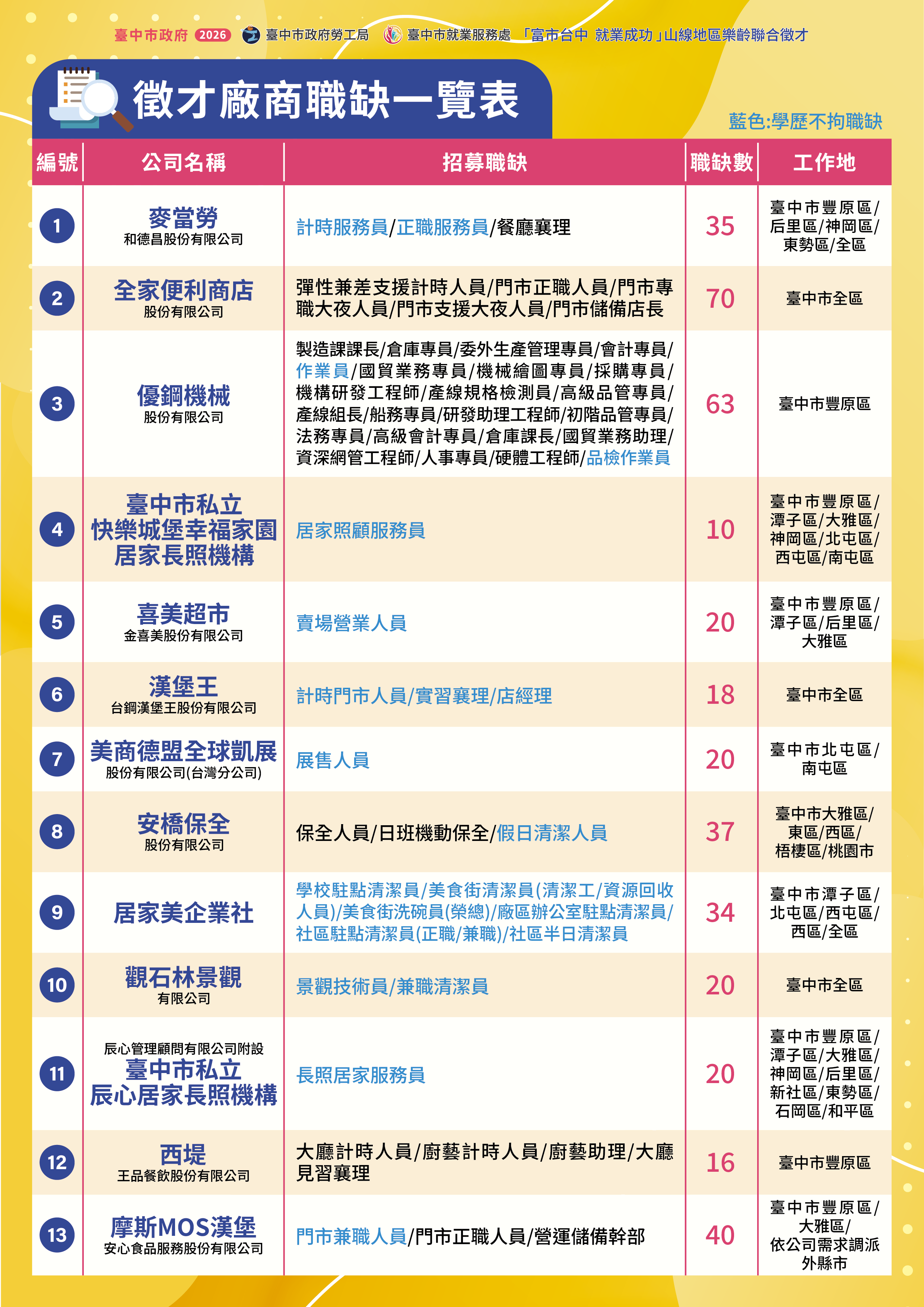【臺中市政府勞工局】訂於115年4月29日(星期三)假陽明市政大樓辦理「富市台中 就業成功」山線地區樂齡聯合徵才,歡迎參加