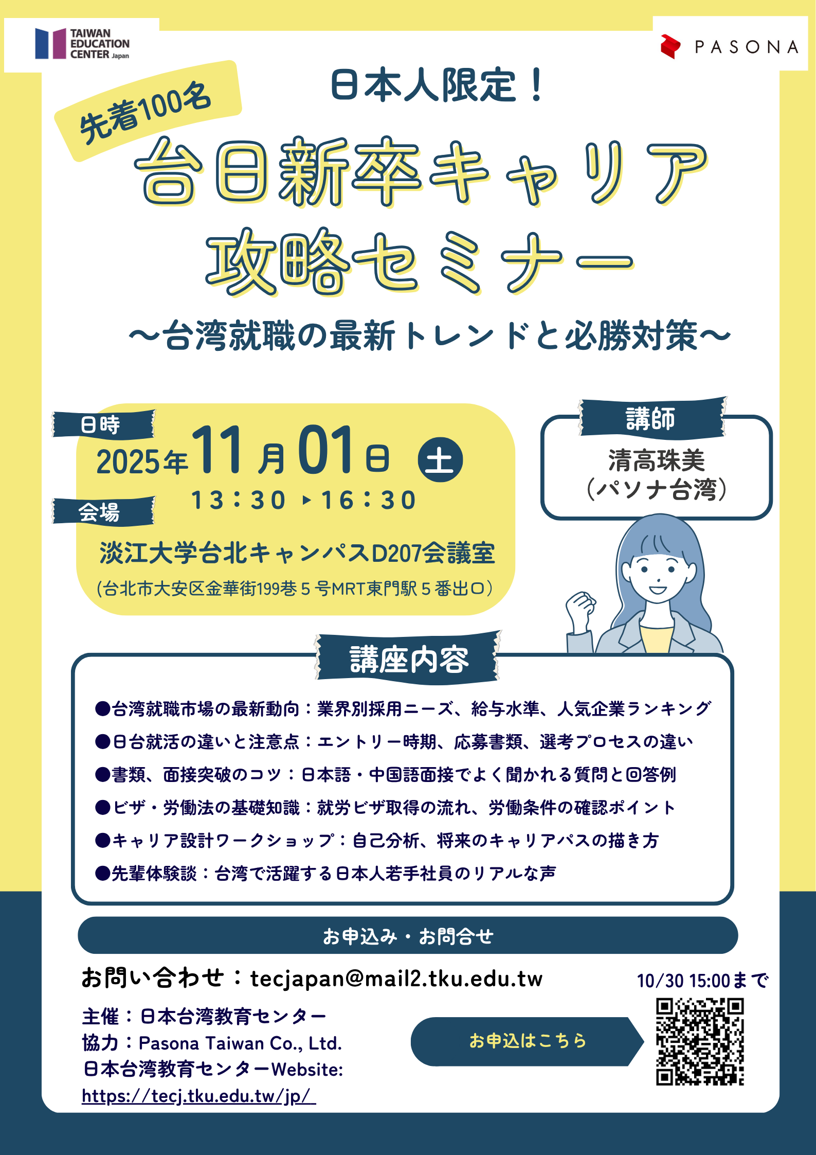 一、日本臺灣教育中心謹訂於本(114)年11月1日(星期四)辦理「日本留學生就業輔導講座」,敬邀各校日本留學生一同參與。