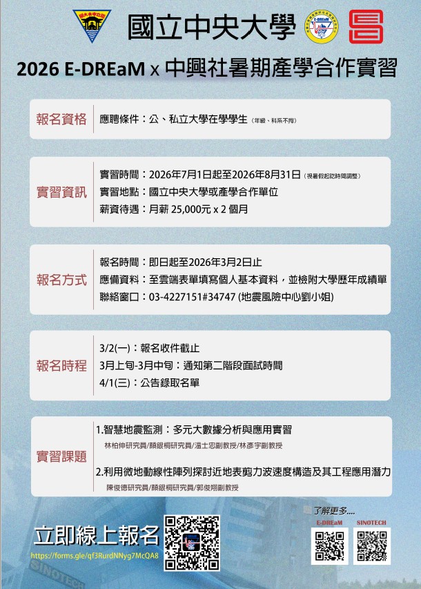 說明:一、申請資格:本活動實施對象為各大專院校大學部在學學生(不限系所)均可報名參加,研習期間為115年7月1日至8月31日。二、報名日期:一律網路報名,即日起至115年3月2日止,申請者請至(https://forms.gle/6kMTWh2sM1xRViwu5)表單,填具相關資訊,詳細資訊請見附件簡章或表單內活動網址,後續錄取公告可至中心網站(https://e-dream.tw/)查詢。三、檢附宣傳海報及報名簡章。