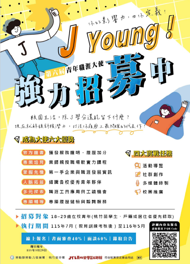 勞動部勞動力發展署桃竹苗分署115年賈桃樂學習主題館辦理「青年職涯大使」招募計畫